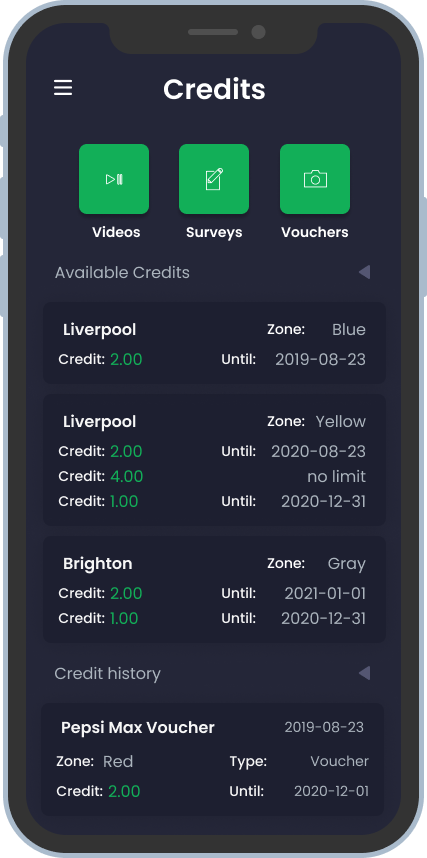 Bank card, top up and credit payment mode is available. Credits are booked parking tickets which are valid for exact zone with validity options. Credits can be received through Parkela Sponsor module in different way like watching advertisements, filling out surveys or even with pre-printed vouchers. Users can monitor their credit balance, usage and even receive a notification about new sponsor campaign.